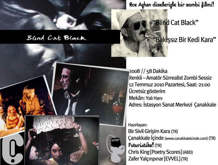 12 Temmuz 2010 gecesi KargART’ta İstanbul seyircisi ile buluşacak olan “Blind Cat Black” (Bkz: İstanbul gösterimi), eşzamanlı olarak aynı gece, Bir Sivil Girişim Kara ve Çanakkale İçinde (www.canakkaleicinde.com) girişimiyle, her yıl düzenlenen Ece Ayhan’ı anma etkinlikleri programı dâhilinde Çanakkale’de, Yalı Hanı İstasyon Sanat Merkezi’nde de gösterime girecek.