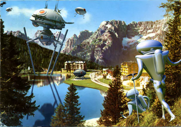 An italian writer that I love is Valerio Evangelisti, creator of “Eymerich the inquisetur” and Dario Tonani, author of the Mondo9 saga. I also know and love some of the italian connectivists such has Luka Kremo, Giovanni De Matteo and many others. I used “invading the vintage” postcards as Urania covers a couple times. Usually I do pure 3d illustrations for those books.