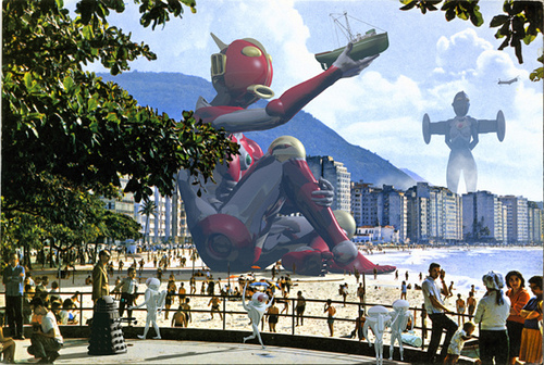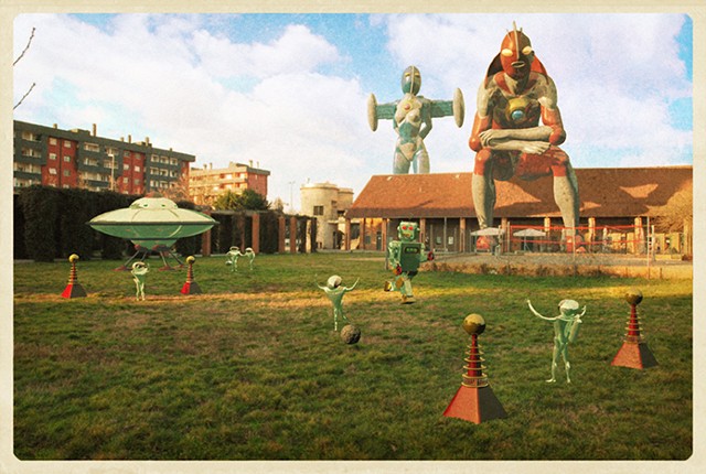I use 3d modelling programs and a lot of photoshop to create my works. I make the characters and I try to put them in the same prospective and light that are in the postcard I want to invade. I also repaint with painter the collage to better melt the 3d renders and the badly printed postcards.