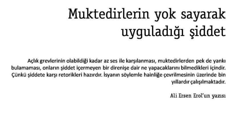Dünyanın ve yurdun birçok yerinde binlerce kişi 12 Eylül’den itibaren süresiz ve dönüşümsüz açlık grevine destek verirken, çok yakında binlerce kişinin ölümünden birinci derecede sorumlu olacak hükümetin başındaki Recep Tayyip Erdoğan, bu durumu bir şantaj olarak değerlendiriyor. İktidar olduğu tarihten itibaren çeşitli örneklerle insan hayatına olan saygısızlığını ve vicdansızlığını türlü örneklerle kanıtlamış biri olduğunu biliyorduk, fakat göz göre göre bir katliamı bize izleterek kendi geçmişimiz ve geleceğimiz üzerinde de büyük bir vebal bırakıyor. Çünkü ölümler gerçekleşmeye başladığında biz hayatta kalanlar bu katliamın yalnızca tanıkları olacağız, onlar için yapabildiğimiz ve yapabileceğimiz sadece polis şiddetinden nasibimizi almış olmak olacak belki de.