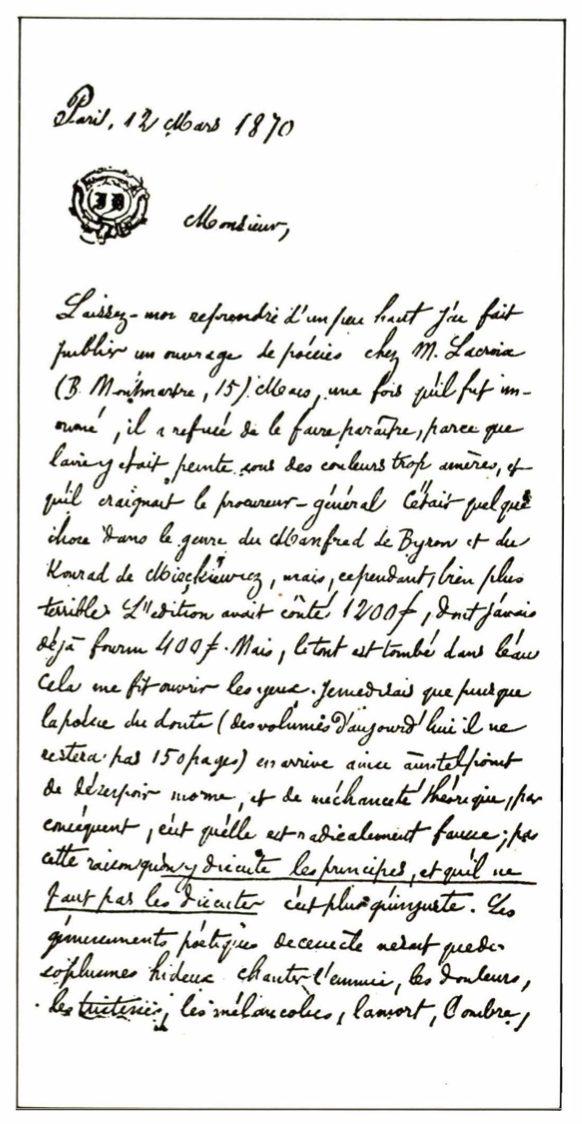 - “Şiir herkes tarafından yaratılmalıdır. Bir kişi tarafından değil. Zavallı Hugo! Zavallı Racine! Zavallı Coppee! Zavallı Corneille! Zavallı Boileau! Tikler, tikler ve tikler. ” “Tiklerin varlığı belirlendiğine göre aynı sözcüklerin sıralarını beklemeden daha sık yeniden ortaya çıkmalarını görmeye şaşılmasın: Lamartine’de atının burun deliklerinden akan gözyaşları, annesinin saçlarının rengi; Hugo’da gölge ve kaçık ciltçiliğin unsurlarıdır.” “Bir insanın zekası ne olursa olsun, düşünme yönteminin herkes için aynı olması gerekir.”