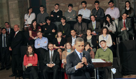Saat 12:00’ye doğru her hazırlık tamam gibiydi. Ortalıkta büyüyen sessizlik kısa süre sonra beklenen kişinin geleceğini haber veriyordu. Gizli servis görevlileri de yerlerini aldıktan sonra ABD Başkanı Barack Obama salona gelerek gençlerle selamlaştı. Simültane olarak İngilizce ve Türkçe çeviri yapılırken Obama önce kısa bir konuşma yaptı.
