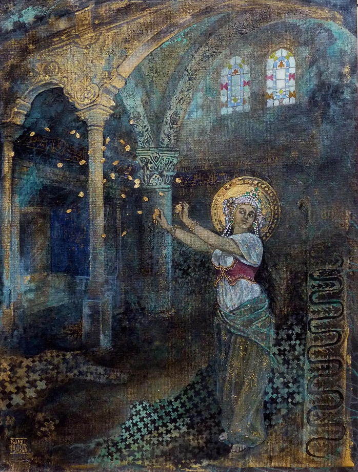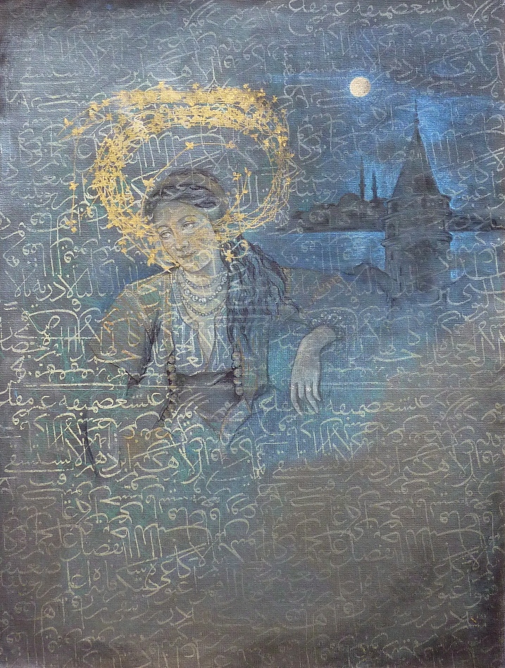 “İstanbul Pentimento” sergisinde ressama soluk veren şehir, tuvallerin dokusuna işlemiş. Tansuğ’un olgunlukla kullandığı tekniklerin açtığı manevra alanında, Bizans prensesleri sarayın harem kadınlarına, kiliseler camilere, düş gerçeğe dönüşüyor. Mitolojik, kutsal veya sıradan kadınlar… üzerlerindeki katmanların ardında gizemliler.
