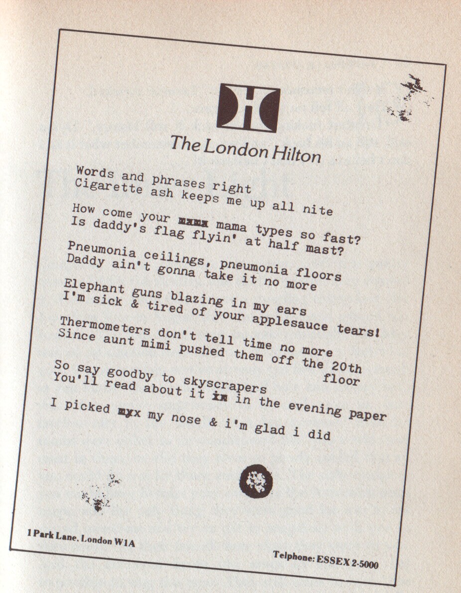 Dylan memnundu. ”İşte bu. Çaktın mevzuyu. Şimdi elimizde olanlar, ‘Kelimeler ve cümleler, sigara külüdür ben tüm gece ayakta tutan!’ Eh, gayet iyi.” Hemen daktiloda söylediklerini yazıp John’dan yeni bir dize düşünmesini istedi.