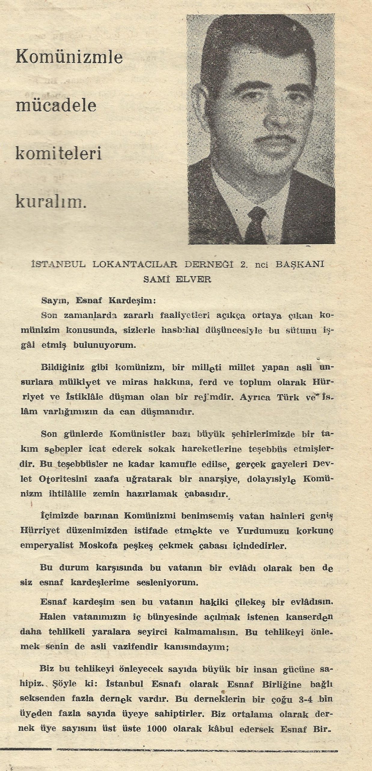 İstanbul Lokantacılar Derneği 2. Başkanı Sami Elver, Esnaf Derneği üyelerine seslenerek, devleti temsil eden organlarla birlikte komite oluşturup komunizm kanserine karşı nasıl örgütleneceklerini anlatıyor.