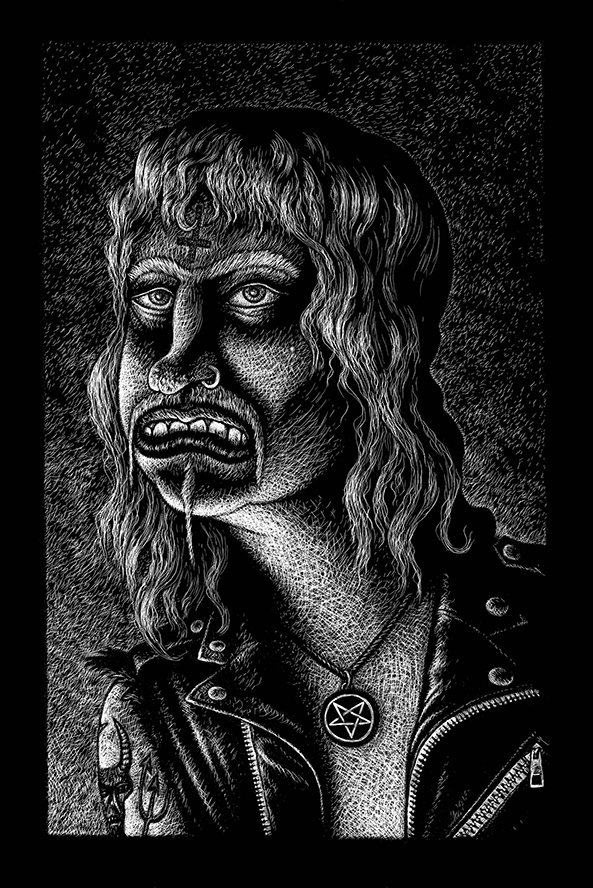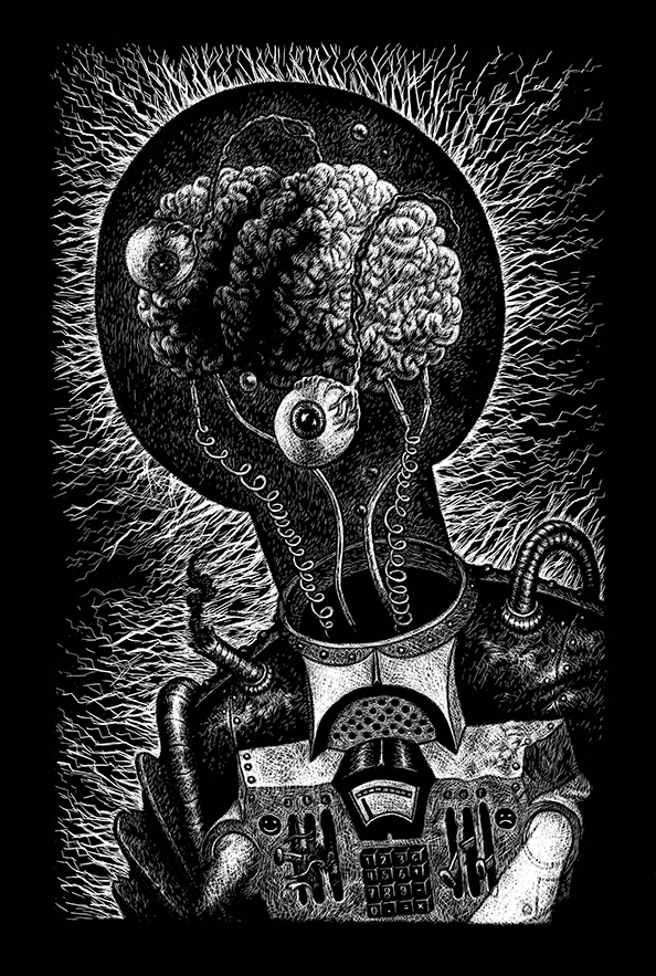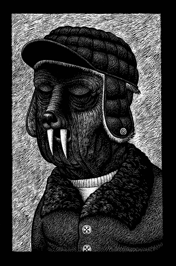 Aslında rengi severim. Ama çizime sırf renkli olsun diye ya da onu daha sevimli bir hale getirmek için renk ekleme fikrini sevmiyorum. Siyah, beyaz ve tüm griler geniş bir palet ile benim arayışlarımı yeterince karşılıyor, kendimi ifade etmeme yetiyor. Tekniğin ağırbaşlılığı, belli bir soyutlamayı da getiriyor ve bu da sayısız renk karmaşasından ve amacından sapmayı engelliyor. Siyah ve beyazın direk kullanımı zaten var, her yönüyle. Bunun kompozisyon, biçim ve ışığa ihtiyacı var. Ve benim açımdan meselenin özü, sahneyi yaratacak bu ışığın arayışıdır, scratchboard tekniğinin ince beyaz çizgilerinin, formları meydana çıkarması ve siyah bir yüzeyde ışığı yoğunlaştırarak canlandırmasıdır. Bundan sonraki asıl downside dozajdır, siyah ve beyazın arasındaki doğru dengeyi zaman içinde bulmayı ve nasıl altından kalkacağını keşfetmek. Hepsinden öte, özenti çizimler yapmamayı öğreniyorsun, fazla ileri gitmeyi göze alamadığın işlerine nazaran çok daha uzaklara gidiyorsun. Bu yolundan çok da fazla dönemediğin bir teknik… Son yıllarda, işlerimde siyah ve beyaza çok daha yoğun bir biçimde odaklandım, özellikle de bunu talep eden çeşitli projelerde. Kendimi doğuştan renkli biri olarak görmesem de bazı işlerimde renk kullanmayı seviyorum. Benim için renkler büyük oranda sembolik, en azından bu, benim renkleri kullanmayı sevdiğim bir yorum biçimi ve sadece böyle durumlarda renklere soyut değerler vererek uyguluyorum. Bir defa ben gerçekçilikten oldukça uzağım; renk sadece nerelerde benim amacıma hizmet ediyorsa oralarda var ve bu durum dış gerçekliğin uygulaması değil.