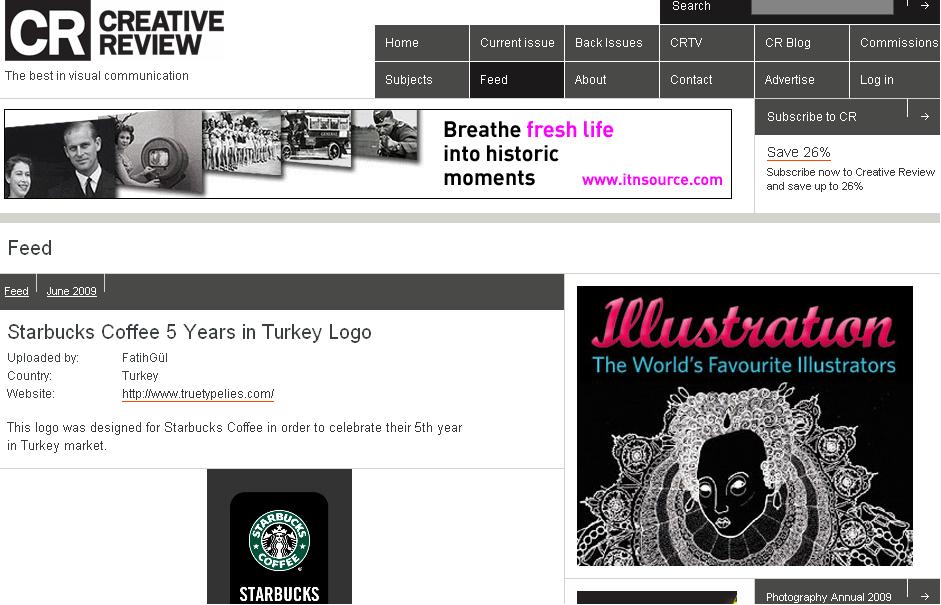 Lenticular kapak tasarımıyla gönüllerimizi uzun zaman önce fethetmiş olan İngiliz kökenli reklamcılık dergisi Creative Review, Fatih’in Starbucks’ın Türkiye’de 5. yılı şerefine tasarladığı logo çalışmasına bu ay internet sitesinde yer verdi.
