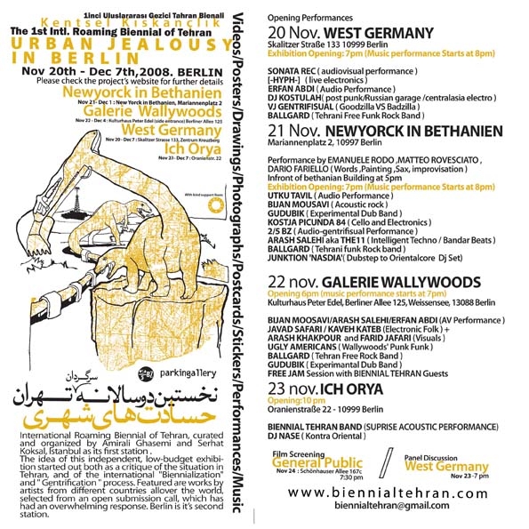 Ailenizin anarko ruhlu dergisi Futuristika, Amirali Ghasemi ve Serhat Köksal (2/5 BZ) küratörlüğünde gerçekleşen Kentsel Kıskançlık – 1. Uluslararası Gezici Tahran Bienali‘nin Berlin ayağına kolektif üretiminin sonucunda ortaya çıkardığı afiş-poster çalışmalarıyla katılıyor. [Bienal Tahran flyer]