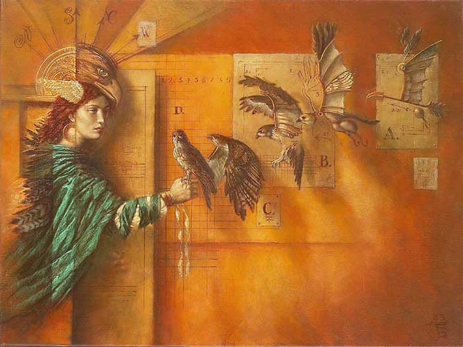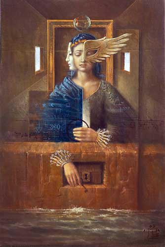 Rüya yorumculuğundan kaynaklanan bir düzlemde eserlerini yaratır. Gecenin baskınlığı, rüyanın erdeminden gelir. Kıskaçta olan bir kadın vardır. Duvarlardan iki delik, kadının arkasına yansır. Hayatın kapalı bir kutu olduğunu ve ancak bize pencerelerden gösterdiğini anlatır. Sağ elinde bir kilit, altında ise sular vardır. Bir şeyleri açmak istediği kesin gibi görünse de kendini kilitliyor da olabilir. Beynin sağ tarafı bir bölünmüşlük yaşıyor. Sağ taraf insanın yaratıcı tarafıdır. Sol ise adaptasyon tarafı. Kadın yani ruh yaratıcılığıyla bir bölünme hali yaşıyor. Sol eli ise bunu çözümlüyor-muş gibi bir durum içindedir. Kalp ile beyin çekişmesi gün yüzüne çıkıyor.