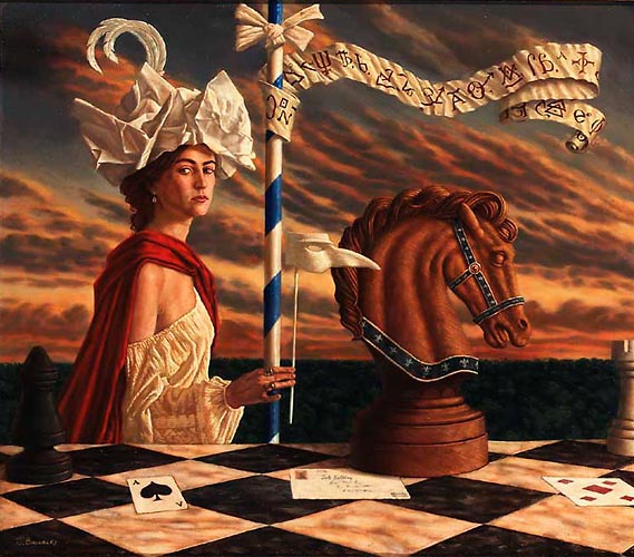 Piyon, at ve kale satranç tahtasında dururlar. Maça as, kadını ve orduyu temsil eder. Bir savaş haberi gibidir bu eser. Kadının başında kağıttan bir şapka vardır. Önemsiz bir şey olduğu halde takılan. Elindeki sancak mavi(özgürlük) beyaz(saflık) göstergesi. Parmaklarıyla değdiği bir karga burun. İnancın sembolizmi.Atın altında ise bir mektup vardır. Burada en önemli ayrıntı ise Karo beşin Kaleye yakın bir konumda olmasıdır.