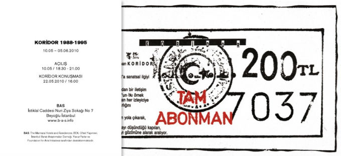 KORİDOR, basılı malzeme, süreli yayın, sınırlı sayıda yapıt kavramlarını sorgulamış, yapısı ve işleyiş biçimi itibariyle, Türkiye güncel sanatında kendinden örgütlenmeye önemli bir örnek olmuştur. Bu kapsamda tüm KORİDOR ekibi 22 Mayıs Cumartesi günü bu döneme ve kollektif üretime ilişkin deneyimlerini konuşmak için BAS’ta bir araya gelecekler.