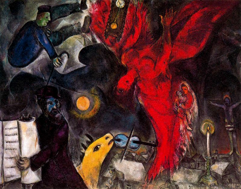 Chagall burada çok gizli bir mesaj veriyor dinlerin tarihine yönelik. Geçmişteki Pan şeytanı ile modern dinlerdeki “düşmüş” melek şeytanı arasındaki farkları… Pan iyi bir müzikseverdir ve zamana pek aldırmaz ama kırmızı şeytan zamanın kölesidir ve müziği çok sevmez. Belki keman çalmaya başladığı için o da telaşa sürüklenmiştir. Yüzündeki ifade o yöndedir çünkü.