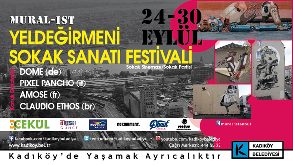 Yeldeğirmeni Mahalle Yenileme Projesi kapsamında, Kadıköy Belediyesi ve Çekül Vakfı’nın evsahipliğinde, çeşitli sponsorların desteği ile düzenlenen festivalde; İtalyan Pixel Pancho 21-26 Eylül’de Nüshet Efendi Sokakta, Fransız Amose 26-30 Eylül’de Karakolhane Caddesin’de, Alman Dome ve Brezilyalı Cladio Ethos 22-30 Eylül’de Misakı Milli Sokakta olacaklar. Festival süresince İskele sokak – Kemal Atatürk Lisesi karşısında yeralan belediyemize ait alanda 26- 27 Eylül saat :20:200 de film gösterimleri, ayrıca bir grup mahalleli çocukla duvar sanatı üzerine çalıştay yapılacaktır.Festivale katılan tüm sanatçılar, mahalle halkı ve sokak sanatı tutkunları ise 28 Eylül akşamı yine aynı mekanda düzenlenecek sokak partisinde bir araya gelecekler. ✪
