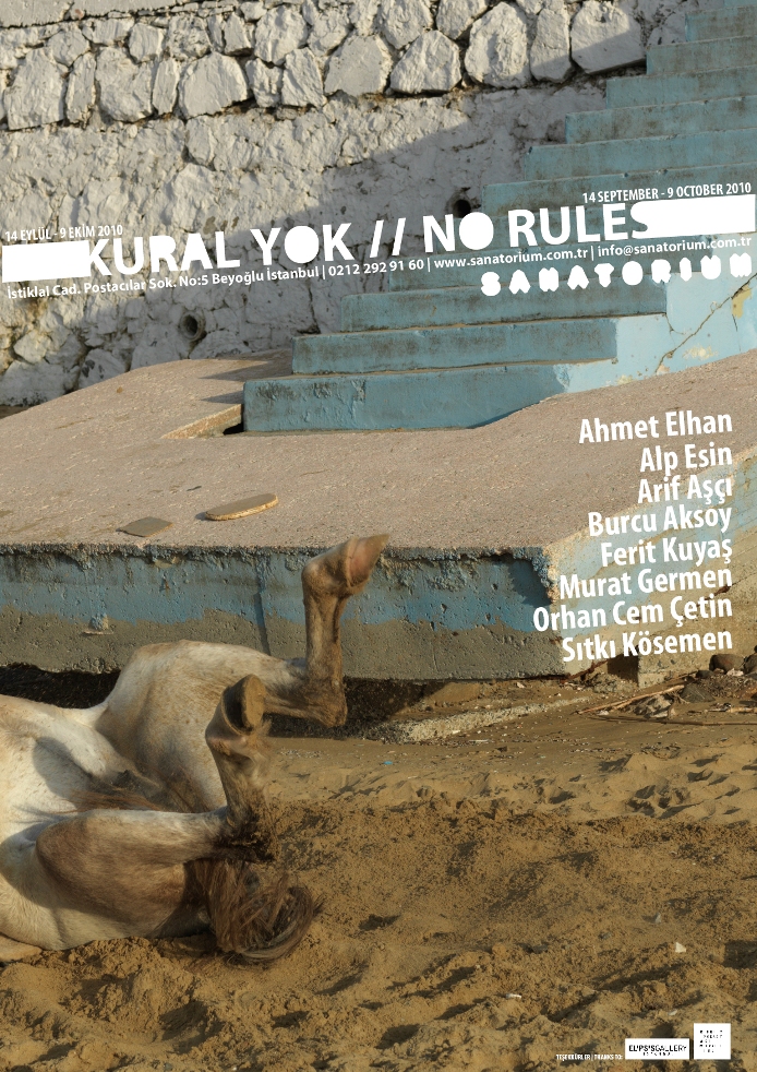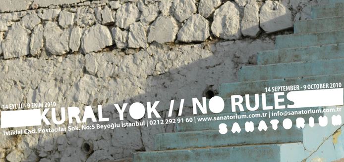 Sanatorium Sivil Sanat İnisiyatifi’nin 2010-2011 sezonu açılış sergisi “Kural Yok”, fotoğraf sanatının klasik anlamdaki ışık, renk, kompozisyon, içerik ve teknik anlayışının dönüşüme uğradığı bir süreci gözler önüne seriyor. Güncel sanatın artık her türlü medya ve malzemeden yararlanarak kendini ortaya koyduğu çağımızda, fotoğraf da kuralların ötesinde çıktığı yolculuğuna türlü değişimlerle devam ediyor. Bu bağlamda, zamanımızın sanat yapıtlarında estetik mükemmellik alışılagelenin dışında aranırken; fotoğraf da, gösterdikleri, gösterme biçimleri ve çeşitli teknolojilerle işbirliği yapmasıyla yeni bir form kazanıyor. “Kural Yok”da yer alan yapıtlar, günümüzde çağdaş Türk fotoğrafının ulaştığı sınırlar ve bu sınırların ileride nerelere kadar uzanacağıyla ilgili ipuçları veriyor.