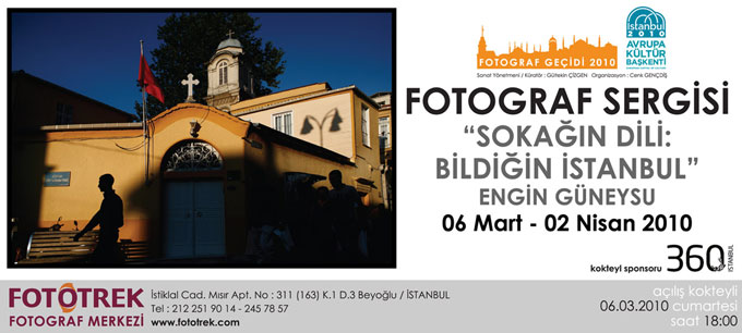 Fotoğraf Geçidi: İstanbul 2010 projesinin yedinci sergisi Engin Güneysu‘nun SOKAĞIN DİLİ : BİLDİĞİN İSTANBUL isimli çalışması. 06 Mart 2010 Cumartesi günü saat 18:00’deki kokteyl ile açılacak olan sergi, 1 yıl sürecek Fotoğraf Geçidi: İstanbul 2010 projesinin yedinci sergisi olacak. Serginin yayınlanacak olan kataloğu da aynı gün izleyicilere sunulacak.