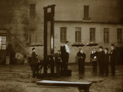Film, kesik kafasının giyotin sepetinden fırlayıp vücuduna geri sıçramasıyla başlar. Sonra infaz platformundan geri geri hapishaneye doğru yürür. Ve böyle devam eder. Bu arada, eylemi sanki her şey standart, kronolojik sırayla gerçekleşiyormuş gibi neşeyle anlatır: kafasını geriye doğru kesmesi onun ‘doğumu’dur. Bir yargıç tarafından bir kadınla evlenmeye mahkum edilene kadar hapiste mutlu bir‘çocukluk’ geçirir. Onunla ilk olarak, büyülü bir kasabın bıçağını kullanarak tüm bir kişiye ‘yeniden monte etmesi ’ gereken parçalanmış bir beden olarak karşılaşır – bir yaratma eylemi olarak yeniden tasarlanan bir cinayet işte.