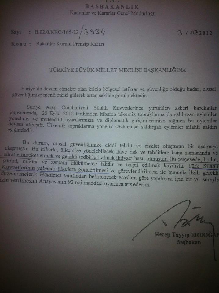 Erdoğan burada yaşanan tek bir olayı 3 farklı şekilde yorumlamakla kalmıyor, aynı zamanda şiddet, ve tehdit algısını artırmakla beraber söylemini gittikçe savaşa yaklaştırarak dinleyicilerini de olası bir seferberliğe doğru hazırlıyor. Erdoğan’ın bu konuşmaları ayrı ayrı analizleri ve eleştirileri gerektirse de, bu yazıda sadece tezkerenin metinine bakacağız. Bunun bir sebebi, tezkerenin metninde Erdoğan’ın tüm bu söylediklerinin—ve gelecekte de söyleyeceklerinin—temellerini görebilmemizden geçiyor. Başbakan’ın tezkeresini analiz etmekteki amaç, tabii ki, devletin dış siyasetini etkilemek değil. Tezkere geçti, toplar atıldı, insanlar öldü. Fakat bu tezkere, egemen gücün, dili kullanarak şiddeti nasıl haklı çıkardığına; toplumsal sınırları nasıl inşa ettiğine; “biz” olanı masum ve “öteki” olanı nasıl kötü ve agresif gösterdiğine; ve kulladığı dil ile şiddeti nasıl aklıselim bir davranışmış gibi gösterdiğine dair çok güzel bir örnek. Tezkerenin metni şöyle: