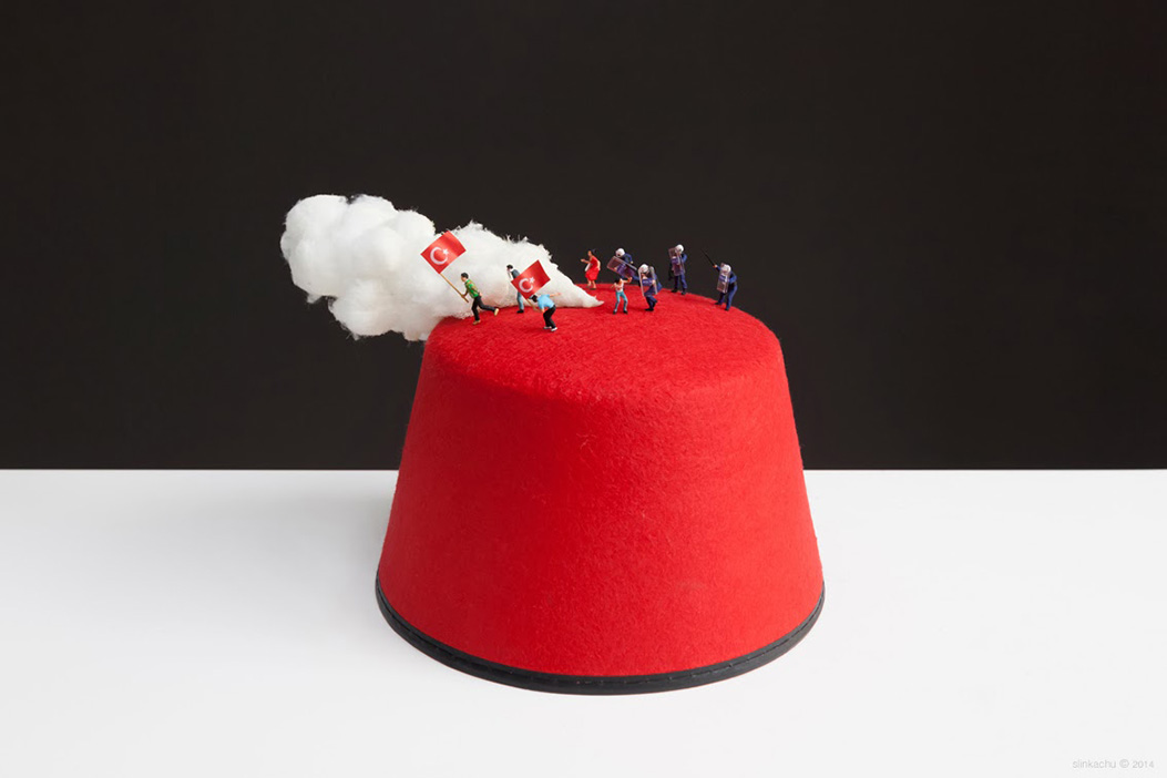 “Fes gecmisi hatirlatan bir sembol, gelecegi degil. Fes giymek, modern yasami ve laikligi tesvik etmek amaciyla, 1920 lerde yasaklanmis. Gectigimiz sene Taksim Meydani’nda yasanan protestolari, her iki tarafinda goruslerini vurgulamak amaciyla, bu simgesel ve sembolik platform uzerinden yeniden canlandirmanin ilginc olacagini dusundum. Bu enstalasyon gectigimiz sene tum dunya medyasinda yer bulan yuzune biber gazi sikilan “kirmizili kadin” i anlatiyor.”
