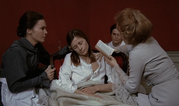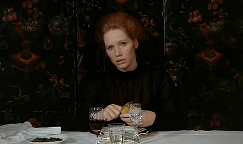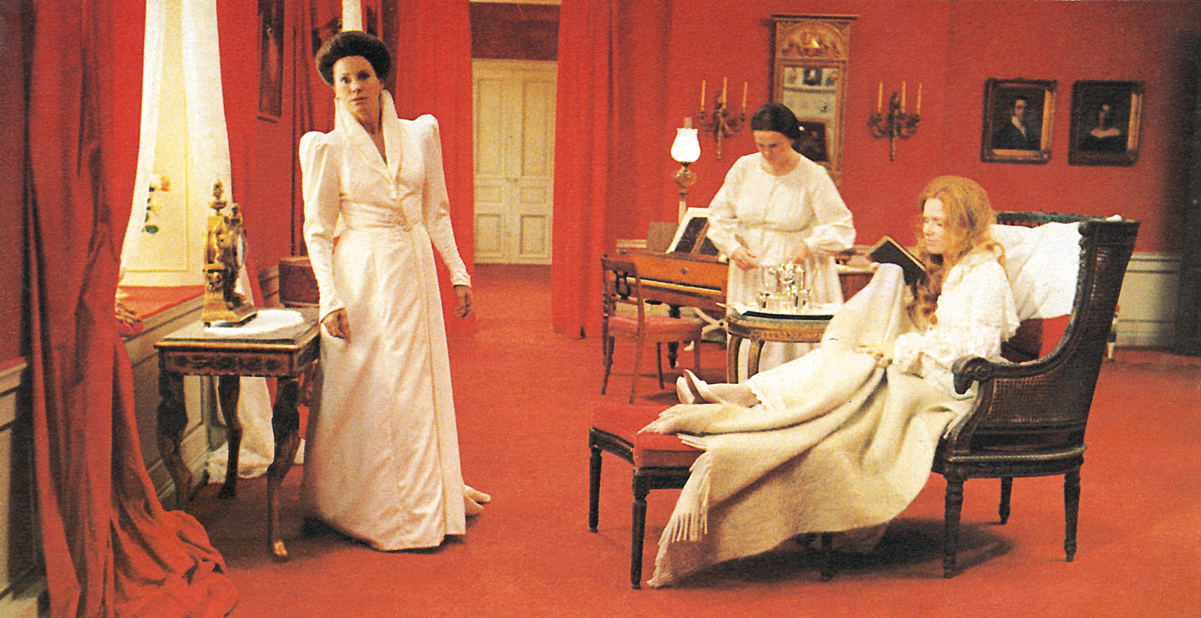 Bergman’ın, kostümleri Yedinci Mühür’e göre çok daha ön planda olan filmi Çığlıklar ve Fısıltılar (Viskningar Och Rop), yine “ölüm” temasından yola çıkarak insana ait her şeye; iletişimsizlik, kıskançlık, sevgi, iyilik, kötülük, mutluluk ve mutsuzluk duygularına ulaşabileceğimiz bir film. Çığlıklar ve Fısıltılar’da kostüm ve set tasarımı işbirliği içerisinde ilerliyor ve izleyicinin karşısına kıpkırmızı mekânlar ve bembeyaz kostümlerden oluşan, filmin yapısına son derece uygun, olağanüstü çarpıcılıkta görüntüler çıkıyor. Olanı olduğundan çok daha güzel göstermeyi başaran görüntü yönetmeni Sven Nykvist’in ve yapım tasarımcısı -aynı zamanda kostüm tasarımcısı da olan- Marik Vos-Lundh’in Bergman’ın öncülüğünde beraberce ortaya koydukları bu film her zaman “en iyiler” arasında yer alır. Bergman’ın zihninde “büyük kırmızı odada ak giysiler içinde dört kadın” imgesiyle beliren film, yönetmenin yaratım sürecinde tesadüfen keşfettiği ressam Leonor Fini’nin resimleriyle de şekillenmiş. Kırmızının en keskin tonunun kullanıldığı objelere ve mekânlara eşlik eden ağırlıklı olarak beyazın kullanıldığı kostümler, filmde yoğun bir simgesel anlam taşıyor. Ölüm Agnes’i (Harriet Andersson) buluncaya kadar beyazlar içerisinde olan kadınlar ölüm’ün gelişiyle karalara bürünüyorlar. Kırmızı ise değişmiyor, olduğu yerde kalıyor, Bergman’a göre o; ruhun içi.