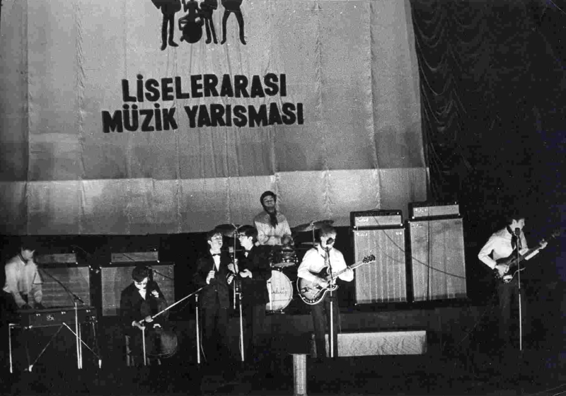 Soldan sağa Jeffy Medina, Raffi Geliboluluoğlu, Muhtar Turan, Ömer Sipahi, Mehmet Ali Babaoğlu, Christoph Sommer, Tevfik Sonder (Milliyet Liselerarası Müzik Yarışması 1969)