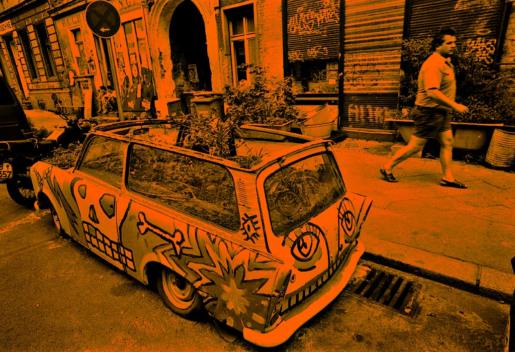 Green flowerpot Trabant in Berlin’s Tucholskystraße (Zöllner / ullstein bild via Getty Images)