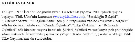 1. yılını kutlayan edebiyat sitesi Yitik Ülke, mail grupları ile de dikkat çekiyor. Yaklaşık 3 bin üyeye sahip site kendi kendine etkili ve güncel bir paylaşım ortamı oluşturuyor. Kadir Aydemir, “Yitik Ülke”yi Konstantin Kavafis ve Soysal Ekinci şiirlerini okuduğu yıllarda keşfettiğini belirtiyor. “Yeni bir ülke” sloganıyla internetteki saygın yerini koruyarak ilerliyor Yitik Ülke, gece gündüz yolu açık ola…